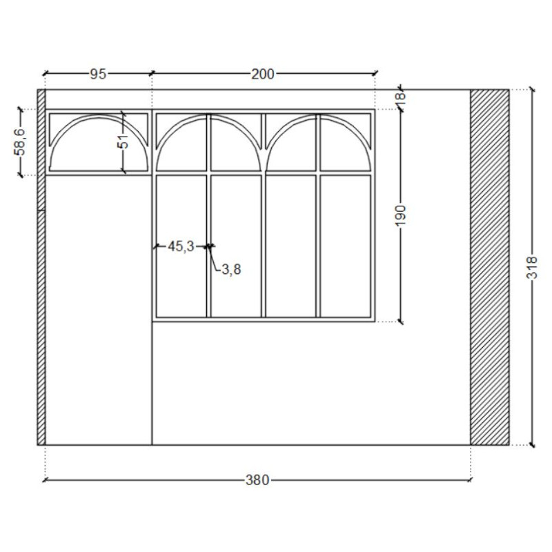 Ensemble de 2 verrières demi arches selon plan, chêne vernis mat incolore, verre trempé sécurit transparent 6mm